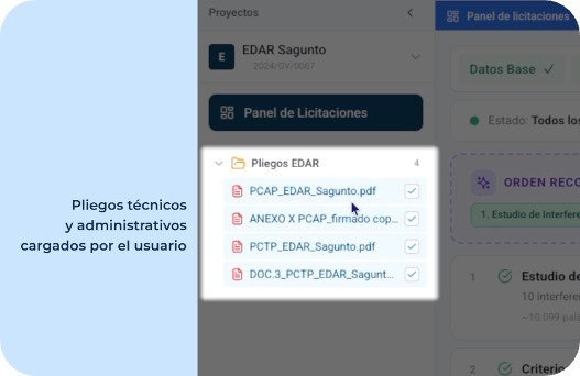 Carga los pliegos de construcción y el asistente extrae el alcance, el contenido principal, puntaciones y las condiciones clave de presentación en una base de trabajo clara.